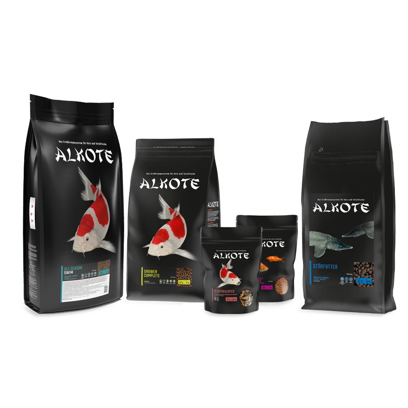 Um Koi und Teichfischen ein gesundes Leben zu ermöglichen und sie kräftig und farbenfroh erleben zu können, haben wir in Zusammenarbeit mit Ernährungswissenschaftler*innen und Züchter*innen unser Alkote Ernährungssystem entwickelt. Das für jeden Anspruch das passende Futter bereithält.