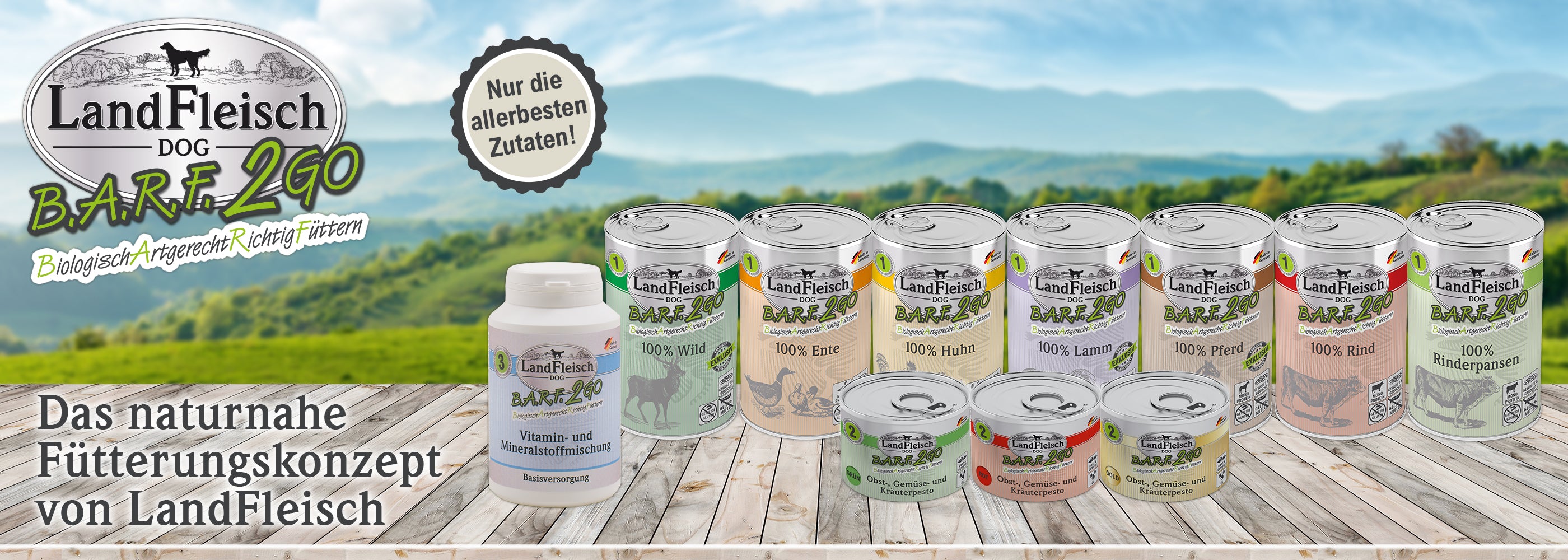 LandFleisch bietet ein Konzept der Vollernährung für Hunde an, das aus drei untrennbaren Komponenten besteht: Fleischtopf, Obst- und Gemüsepesto sowie einer Vitamin- und Mineralmischung. Diese Kombination ergibt eine ausgewogene Ernährung. B.A.R.F.2GO ist ideal für Hunde mit Futtermittelunverträglichkeiten und für BARFer auf Reisen. Sieben Sorten Fleischtopf und drei Sorten Obst- und Gemüsepesto sorgen für Abwechslung im Napf.