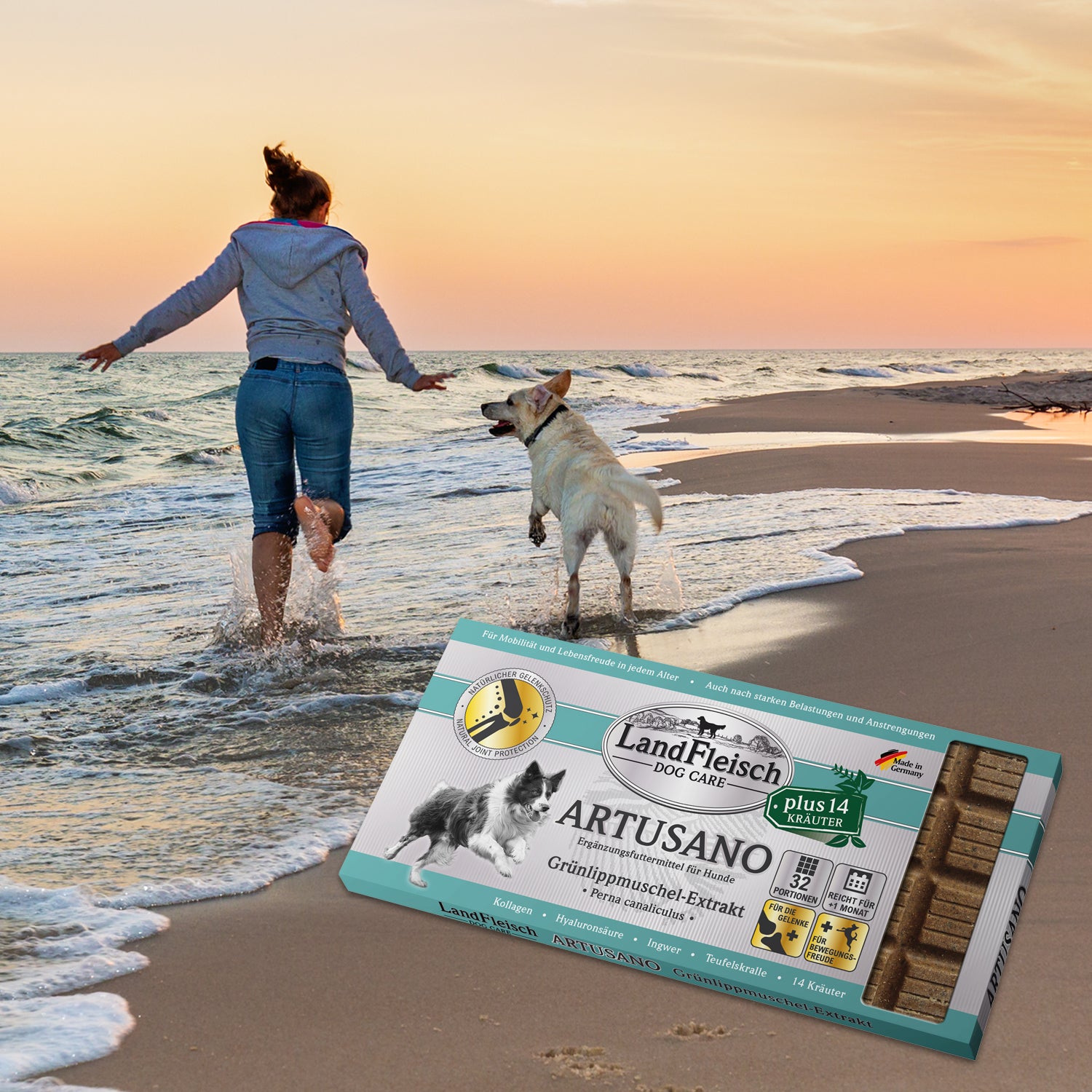 LandFleisch Dog Care ARTUSANO ist ein einzigartiges Ergänzungsfuttermittel mit natürlichem Gelenkschutz. Es enthält Grünlippmuschel-Extrakt zur Unterstützung der Mobilität und Lebensfreude von Hunden jeden Alters. In praktischer Schokoladentafelform mit 32 Portionsstücken reicht es für über einen Monat und steigert die Bewegungsfreude Ihres Hundes.