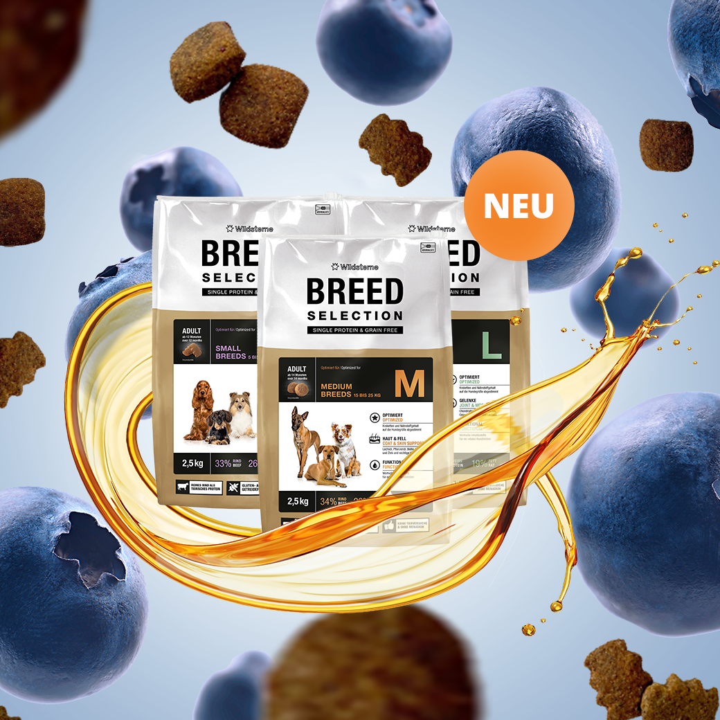 Aus unseren Erfahrungen ergab sich als logische Konsequenz die Entwicklung von Spezialfutter für einzelne Rassen. So entstand die Wildsterne Breed Selection für eine optimale funktionale Versorgung, die auch auf rassetypische Gesundheitsprobleme oder Eigenheiten eingeht und durch die Verwendung von reinem Rind auch für viele Allergiker geeignet ist.