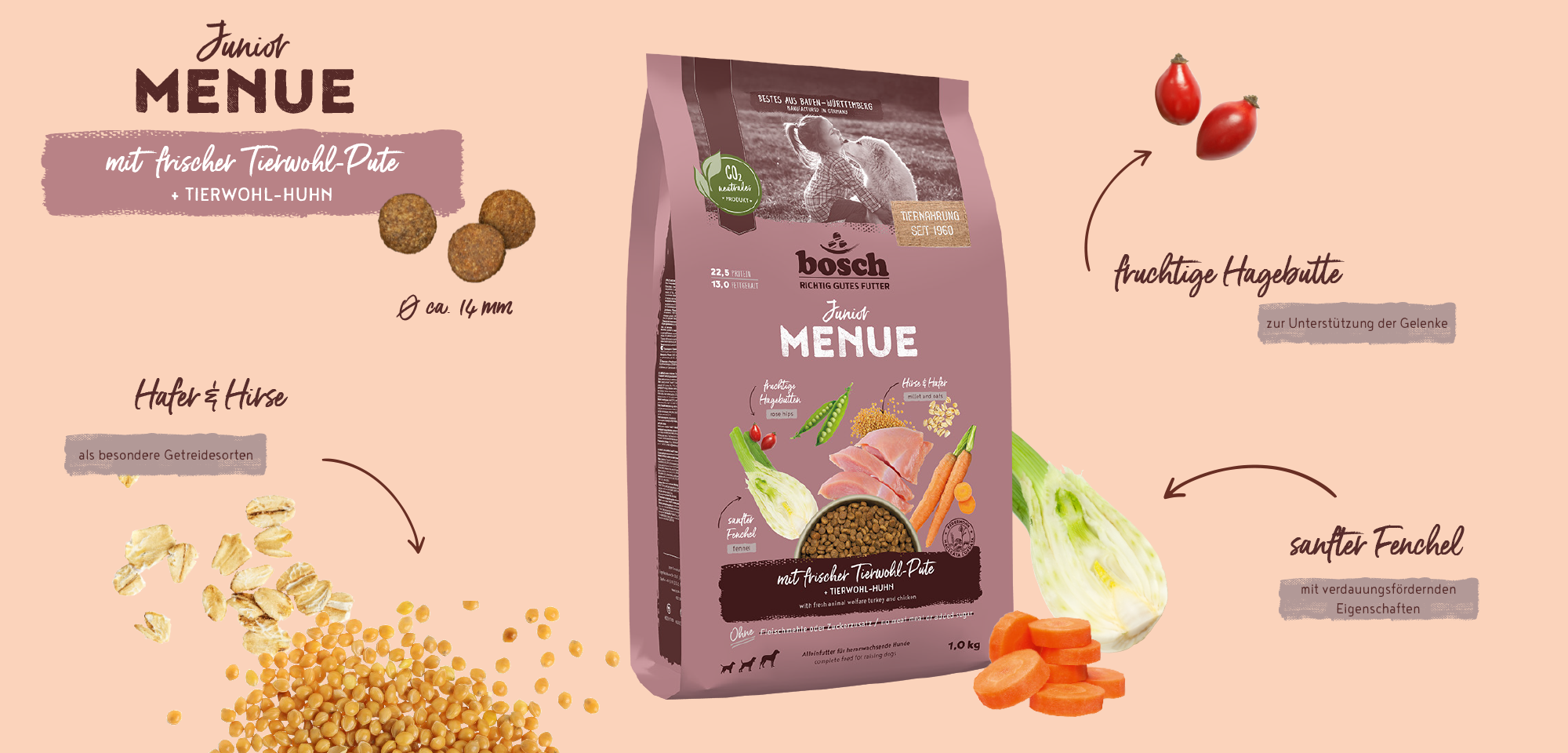 Frisches Tierwohl-Huhn (38 %), Hirse (Milo, 17 %), frische Tierwohl-Pute (12 %), Erbsenstärke, Kartoffelstärke, Hafer (4 %), Lachsöl, Dicalciumphosphat, Proteinhydrolysat, Erbsen (getrocknet, 0,9 %), Leinsaat, Natriumchlorid, Fenchel (getrocknet, 0,2 %), Hagebutten (getrocknet, 0,2 %), Kaliumchlorid, Karotten (getrocknet, 0,1 %), Federmohn (getrocknet, 0,1 %).