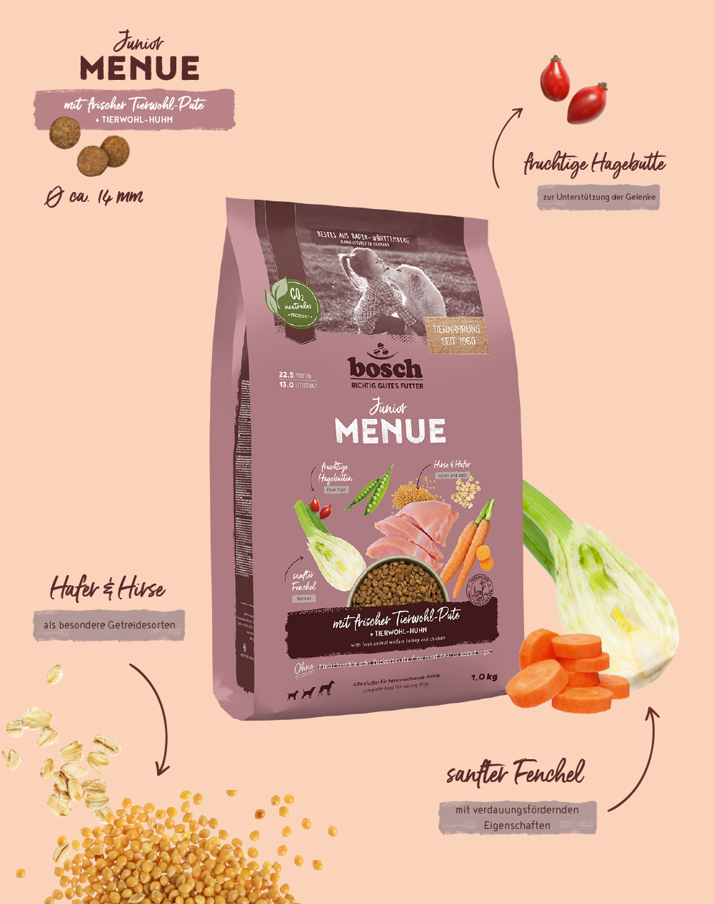 Unser leckeres MENUE für deinen lebensfrohen Hund basiert auf einer bunten Vielfalt an hochwertigen, vorwiegend frischen und erlesenen Zutaten - ganz ohne Schnickschnack, wie z.B. Fleischmehl, Zuckerzusatz, Soja oder Gentechnik.