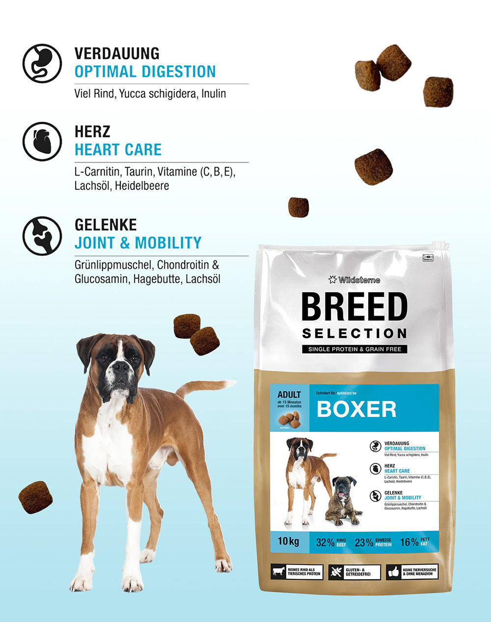 Wildsterne Breed Selection - Adult Boxer sorgt mit ausgewählten Zutaten und Nährstoffen dafür, die besonderen Bedürfnisse von Boxern ab dem 15. Lebensmonat voll abzudecken.