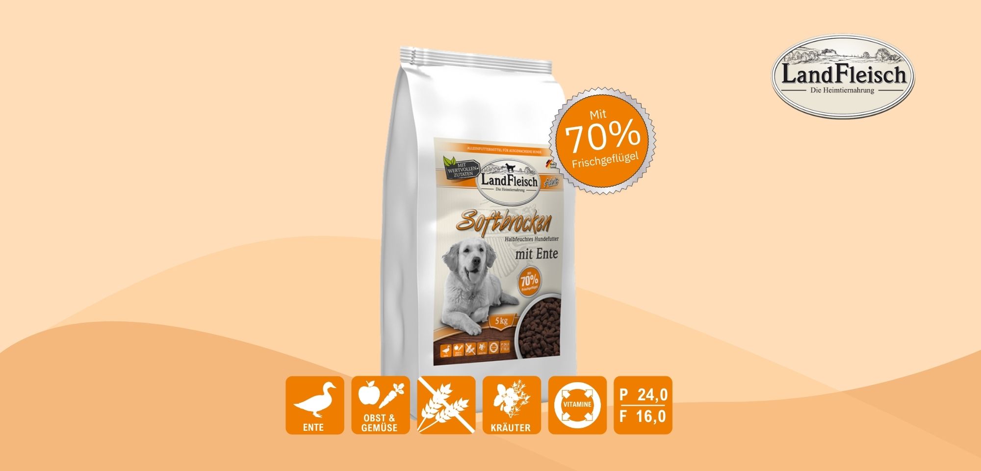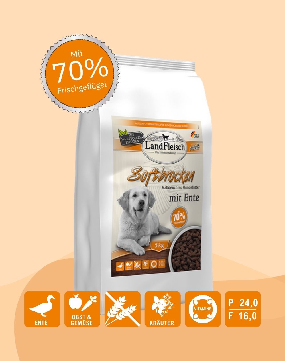 Welche speziellen Futtereigenschaften hat das LandFleisch Softbrocken Trockenfutter mit Ente?